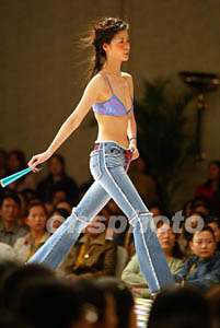 香港mudd jeans 2003年春夏时装展二十六日在北京中国大饭店举行,模特展示具有青春活力的休闲春夏时装。作者:毛建军