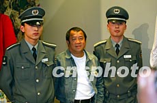 香港演艺名人曾志伟二十六日亮相在北京举行的香港时尚汇展场馆,被保安拉住合影。作者:毛建军