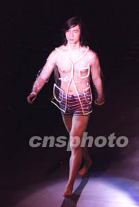 三月二十六日,有“今日青年潮流指标”之称的卡宾服饰在北京电影制片厂摄影棚内举行时尚男装秀,欲以别致的舞台效果掀起全新时尚风暴。图为卡宾演绎透明男装。作者:武仲林