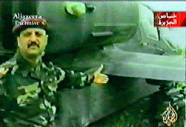27日,美阿帕奇直升机在中幼发拉底地区被伊拉克防空炮火击落。图为卡塔尔半岛电视台播放的画面,一名伊军官在坠落的直升机前做讲解。