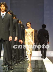 “款式与时尚同步”的爱都品牌西装三月二十八日亮相于2003北京中国国际时装周的T字台上,深受女士们的青睐。作者:史利