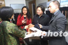 正在北京举行的2003中国国际时装周为中外企业洽谈生意牵线搭桥。图为中国企业家与意大利面料供应商洽谈生意。作者:史利