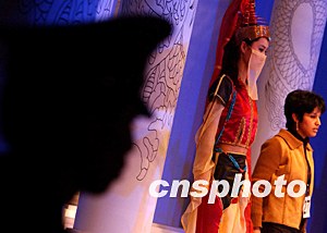 北京饭店的保安护卫着三月末在此间举行的国际青年时装师大赛,来自摩洛哥的学生正在展示她设计的迷人中东风情时装。作者:贾国荣