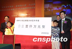 湖南沐林现代食品有限公司董事会主席伍跃时30日在北京人民大会堂通过中国光彩事业促进会、中国少年先锋队全国工作委员会等单位,向中小学生捐赠价值1000万元人民币的沐林谷物营养早餐,拉开“健康从早做起,健康奔小康”活动序幕。作者:赵振清
