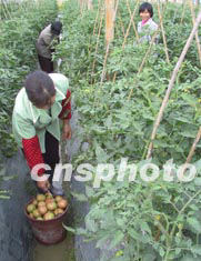 生态条件优越的福建西部近年大力发展绿色农业,无公害绿色农产品远销香港和内地一些大中城市。图为长汀县远山农业发展有限公司员工采摘无公害西红柿应市。作者:刘可耕