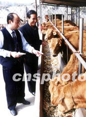 山东省枣庄市山亭区农村信用社,大力扶持当地农民发展畜牧养殖业,使该区养殖专业户达到四千六百多家。图为信用社主任(左)向养牛专业户了解牛的生长情况。作者:李宗宪