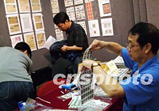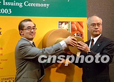 香港邮政4月4日发行纪念封,纪念香港邮政参与由香港邮学会主办的香港邮展2003。图为香港邮政副署长曾国林及香港邮学会张文德医生在纪念封上盖印。作者:洪少葵