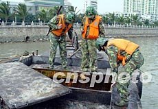 广东边防部门于四月四日晚到四月五日上午,在该省展开打击沿海地区成品油走私活动专项行动,查扣走私红油近百吨。图为边防官兵查扣走私船只。作者:唐 徐