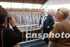 几名外国游客四月初在陕西秦始皇陵兵马俑博物馆里拍照留念。四月的西安春光宜人,前来参观旅游的中外游客络绎不绝。作者:武仲林
