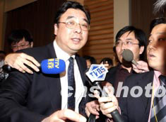 中国国务院新闻办十日在北京举行非典型肺炎新闻发布会,卫生部副部长马晓伟在发布会结束后被记者们追访。作者:张炜