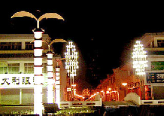 在安阳的中心大道上,记者看到,三三两两的市民或游人正悠闲地散步,路灯把街道照得亮如白昼,白天雄伟的建筑在灯光的衬托下也显得那么温柔,人行道边形状、种类各异的花、树为你增添了些许清新,花草丛中的低低的发着幽光的坛灯又为你增添些许浪漫。