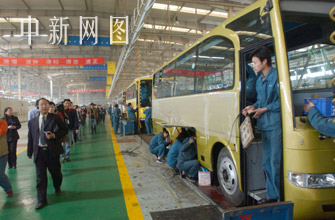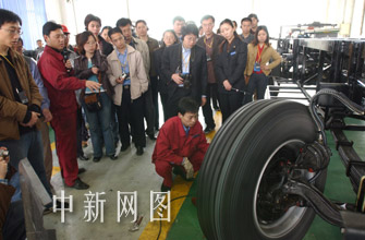 网络媒体记者参观河南宇通客车生产线。慎重 摄
