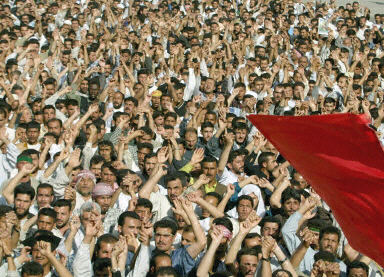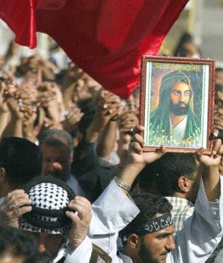 4月14日在伊拉克的南部城市纳杰夫,伊拉克的什叶派教徒举行了大规模的反战示威游行。