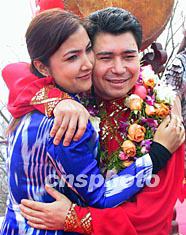 “二OO三阿迪力极限之旅”四月十六日在北京幕田峪长城举行启程仪式。“高空王子”阿迪力将进行极限表演。图为阿迪力在临行前与妻子相拥。作者:盛佳鹏
