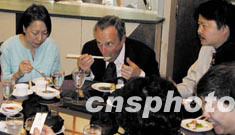喜爱中餐的纽约市长布隆博格(左二)十六日中午在纽约华埠中餐馆“糖潮食坊”宴请华裔人士,以行动回击华埠有非典型肺炎的谣言。作者:侨报