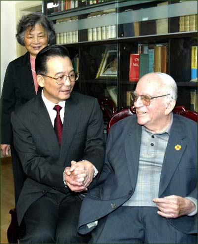 中新网4月20日电 中共中央政治局常委、国务院总理温家宝20日上午来到全国政协常委、外国老专家爱泼斯坦寓所,亲切看望了爱泼斯坦同志,并代表党中央、国务院祝贺他在华工作70年暨88寿辰。
