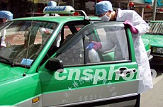 甘肃兰州市疾病预防控制中心,近日对该市所有的士进行消毒,以预防“非典型肺炎”的发生。作者:刘呈军