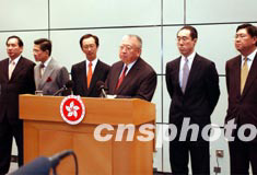 香港特首董建华连同政府高官,4月23日在政府总部宣布将推出118亿港元的八项救市措施,纾缓SARS疫情对本港经济的影响。中新社传真 洪少葵 摄