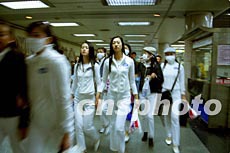 几名上海国际汽车展的车模小姐二十四日在上海地铁匆匆而行。为了控制“非典”在沪蔓延,上海国际汽车展今日提前闭幕。作者:刘殊瑾