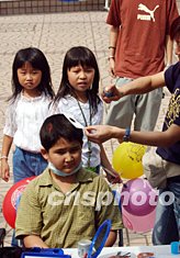 小朋友纷纷暂且放下口罩参与喷画摊位的化妆游戏。洪少葵 摄