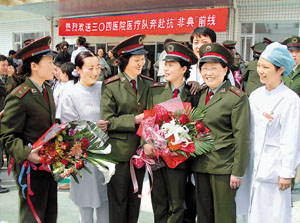 下午2时,304医院举行庄严而简短的欢送仪式。记者看到,30名英姿勃勃的医疗队员在全院战友的鲜花和掌声中登上汽车,院领导亲自送他们赴定点医院。记者还在海军总医院、307等医院的政治部门看到了数千份请战书、决心书。