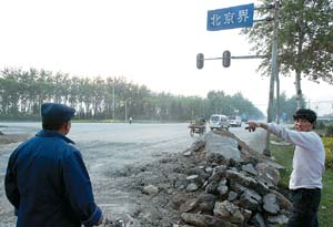 记者停车观察,路旁的水泥柱上挂着一块“北京界”的牌子,这里是北京市和河北省香河县交界的地方。