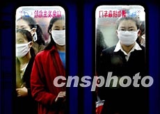 北京抵御SARS困扰之际,乘坐地铁的上班族戴上厚厚的口罩,加强自身防护奔赴岗位。作者:郑萍萍