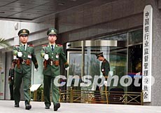 中国银行业监督管理委员会二十八日正式挂牌。银监会将行使原由中国人民银行履行的监督管理职权。图为武警战士在银监会门前执勤。作者:毛建军