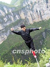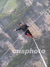 “高空王”阿迪力二十八日在重庆奉节小寨天坑成功试走横跨天坑、总长800米的钢丝。五月三日阿迪力将在这段钢丝上表演达瓦孜绝技,挑战高空钢丝行走极限。作者:盛佳鹏