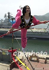“高空飞燕”王海燕二十八日在深圳明思克航母热身。她将在航母海空之间高六十米、长二百多米、直径二十一点五毫米的钢索上生存三十一天。作者:陈文