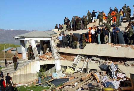 穆斯塔法以及同宿舍的孩子们是幸运,可更多的同学就没有他们这么走运了,因为四层高的宿舍楼整个儿塌了下来,把140多个中小同学全都活活地埋进了废墟,一些孩子就在睡梦中被塌下来的水泥梁住活活砸死,更多的孩子则被困在了废墟中。与此同时,巴克尔市到处传来房屋和桥梁倒塌的消息,宾格尔省省长阿里-科斯堪告诉记者说,总共有25幢房屋和1座桥座倒塌,当地的输电塔和电线杆悉数倒塌,整个地区的电力和电话通讯全部中断。有数百人受伤或者被埋在废墟中,其中要数巴克尔市郊的寄宿学校情况最为严重。