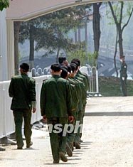 武警官兵五月二日已经隔离北京小汤山战地医院,护卫解放军白衣战士迎战“非典”。作者:贾国荣