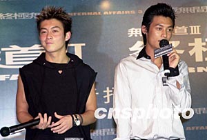 歌星余文乐、陈冠希5月2日在香港出席电影《无间道Ⅱ》及《无间道Ⅲ终极无间》新闻发布会,余文乐、陈冠希早前传闻不和,今天两人大方地站在一起宣传新片。邓庆乐 摄