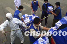 五月六日,社会各界捐赠给医护人员的大批物品运抵被隔离的北京人民医院。中新社记者:史利
