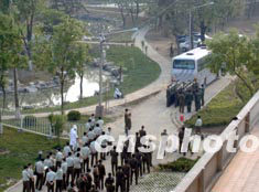 七日晚,小汤山医院将接转第五批病人,从而使这里入住的患者总数达五百人左右。图为小汤山医院隔离区内外。中新社记者:安然