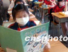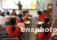 随着香港“SARS”疫情的逐渐稳定,香港数百所小学的高年级学生五月十二日开始复课。在湾仔学校复课的第一天,老师向学生提问有关如何防预“SARS”的基本知识。中新社记者 钱兴强 摄