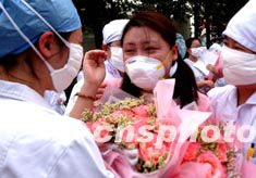六十名从抗击“非典”一线凯旋的北京友谊医院第一批医疗队十二日回到医院,受到全院医务人员英雄般的欢迎。迄今为止,北京友谊医院已先后向抗击“非典”一线派出两批共计一百三十多名医务工作者。中新社记者:武仲林