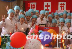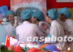 北京友谊医院的白衣天使们十二日在院内欢度护士节。迄今为止,北京友谊医院已先后向抗击“非典”一线派出两批共计一百三十多名医务工作者。中新社记者:武仲林