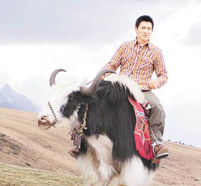 中新网5月13日电 香港艺人刘德华早前到云南丽江玉龙雪山拍摄最新一辑绿茶广告,在上辑广告中,导演找来老虎BB跟华仔合作,而这居然是雪山牦牛跟华仔做拍档,在一片草原上华仔优哉游哉扮牧牛郎,构成一幅优美的风景画。