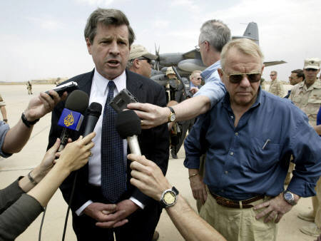 新任美国驻伊拉克行政长官布雷默(左)12日飞抵伊拉克巴格达机场,正式到职就任。布雷默将接替前美国将军加纳,负责监督伊重建工作与政治重组。图为布雷默当天在巴格达机场接受媒体访问。