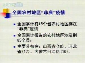 但是在这个关键时刻,我们绝对不能放松警惕,不能麻痹大意,我们要防治病情的反弹。特别是是我们要注意到疫情在新的情况底下蔓延,所以我要讲一下第二个问题,我们要禁止疫情向农村扩散,我们现在先看这个数字,现在全国已经有15个省,农村地区存在了非典疫情,已经有85个县分布在山西省河北省和内蒙古自治区。这个比例比较高。另外,确诊病例中,农民占的比例虽然不高,只有6%左右,但是我们看到从5月1号开始,这个比例是持续上升的,到5月11号已经达到了6.2%,从这个数字我们可以看到,在农民和农村的疫情虽然比较轻,但是有上升的趋势,我们一定要密切注意这个疫情向农村蔓延的趋势。