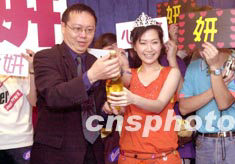 歌星关心妍5月14日在香港尖东Neway卡拉OK举行的新歌祝捷会上,与唱片公司高层齐开香槟,庆祝其新歌《优先订座》在香港三大中文电台于上周的播放率均名列三甲。中新社传真 邓庆乐 摄