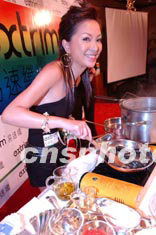 为一家纤体产品出任代言人的艺人利嘉儿,5月15日示范烹调高卡路里美食,笑谈天堂式减肥方法。中新社传真 洪少葵 摄