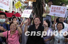 香港市民5月15日汇集在立法会外,高举标语“万众一心,抗御SARS”及支持特首董建华。中新社传真 洪少葵 摄