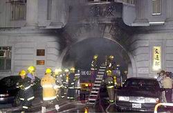 据了解,“交通部”的正门口15日晚间7时28分燃起熊熊大火,一辆挂在桃园龟山友立公司的小货车,从桃源街又转后即直冲“交通部”门口,驻守警卫紧急联络消防人员,19辆消防车紧急赶往现场,火势约在20分钟内扑灭,办公室内加班员工及数十名媒体记者所幸安然无恙,但“交通部”正门口已被凶猛的火势烧得一片焦黑,火焰甚至高达4楼。
