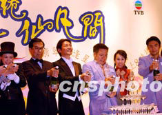 正在香港热播的《谴绻仙凡间》电视剧收视报捷,众演员5月16日开香槟庆祝收视理想。中新社传真 洪少葵 摄