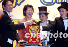 正在香港热播的《谴绻仙凡间》电视剧收视报捷,【左起】主角江华、黄卓玲、杨思琦等艺员5月16日表演魔术庆祝,唯妙唯肖。中新社传真 洪少葵 摄