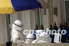 四位全副武装的医生,16日在北京地坛医院的“非典”病房外休息时查看病历。中新社记者:盛佳鹏
