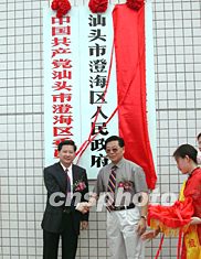 广东汕头澄海五月十九日举行撤市设区揭牌仪式,汕头市长李春洪(右二)和澄海区长陈棉生(左二)揭牌。作者:王惠存