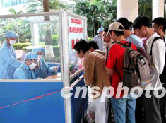 高考临近,海南省在口岸设立接待处,对在外借读返琼的考生进行严格检查,以防输入性“非典”进入海南。作者:李建国